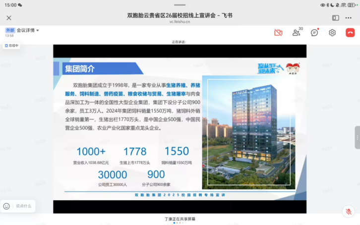 为拓宽毕业生就业渠道,搭建高效的供需对接平台。1月12日下午15:00,生物科学学院在线上举办了双胞胎股份有限公司专场招聘宣讲会。学院2026届部分毕业生参加了此次宣讲 。