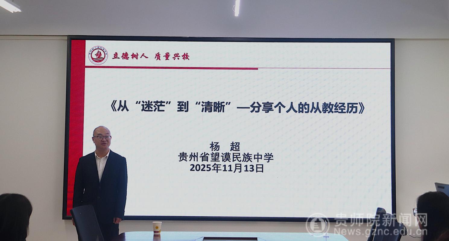 为助力学生明晰职业发展方向,汲取从教经验,11月13日,生物科学学院特邀贵州省望谟民族中学杨超老师,于宁静楼611开展《从“迷茫”到“清晰”——分享个人的从教经历》主题学术讲座。本次讲座由学院副院长孟泽彬主持,24应生一班学生到场聆听。