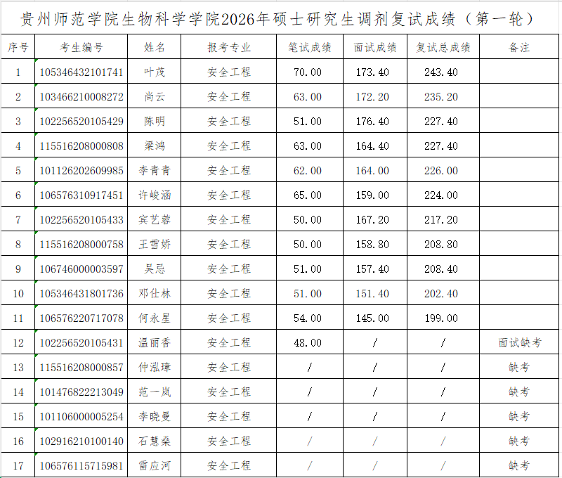 贵州师范学院生物科学学院2026年硕士研究生调剂考生进入复试名单(第一轮)